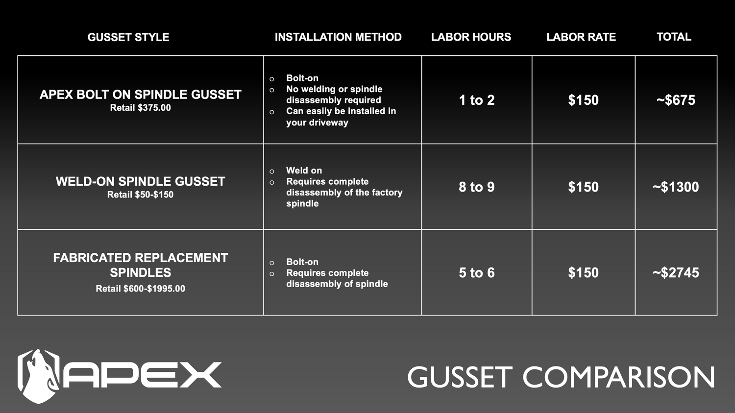 Bolt-on Spindle Gusset benefits: